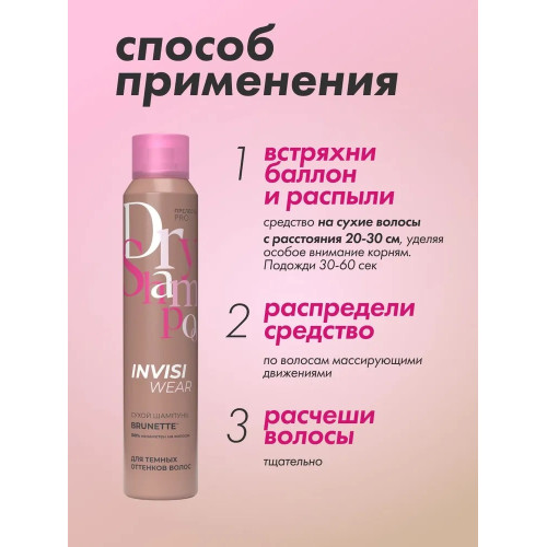 Сухой шампунь для шатенок и брюнеток Прелесть Professional Invisiwear Объем и сияние с подкрашивающим эффектом абсорбирует жирный блеск волос и головы, делает локоны объемнее, помогает подкрасить корни волос и поддерживать их цвет между окрашиваниями.