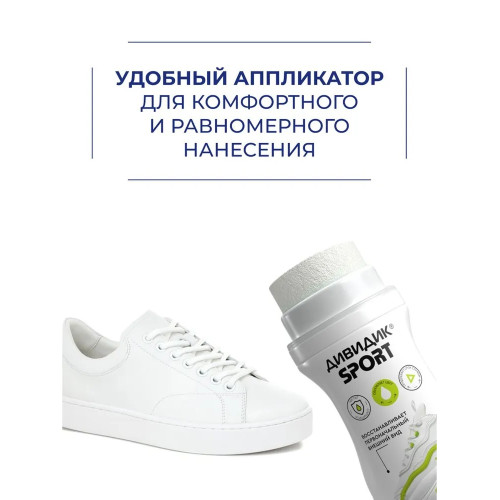 Крем краска для обуви белая Дивидик спорт в удобной упаковке с аппликатором губкой, дозатором, эффективно закрасит трещины, мелкие царапины, потертости и другие повреждения, а также поможет избавиться от заломов на белой обуви. Краска для белых кроссовок поможет восстановить внешний вид и вернуть идеальную белизну любимым кроссовкам.