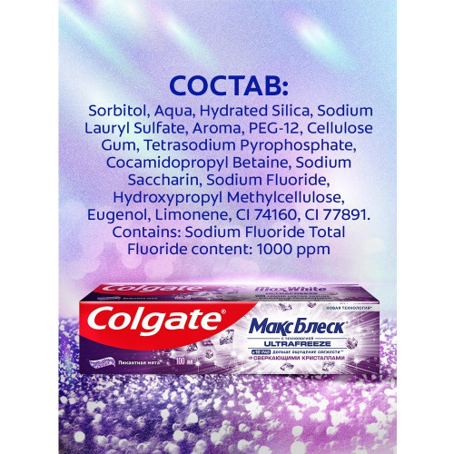 Отбеливающая зубная паста Colgate Макс Блеск Пикантная мята 100 мл со сверкающими кристаллами помогает восстановить естественную белизну зубов, а также придает свежесть дыханию для еще большей уверенности в себе.