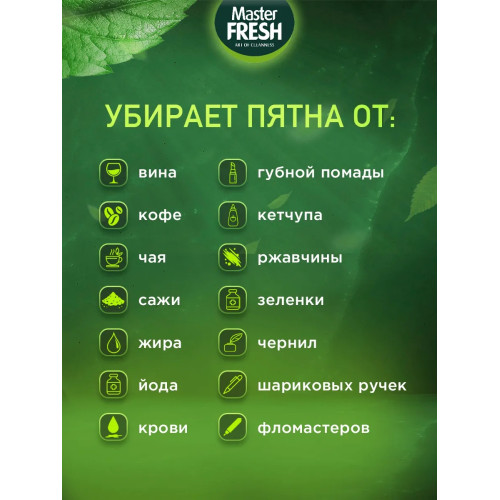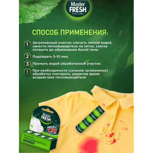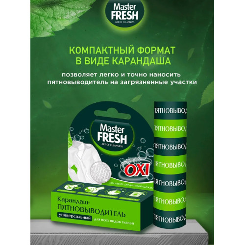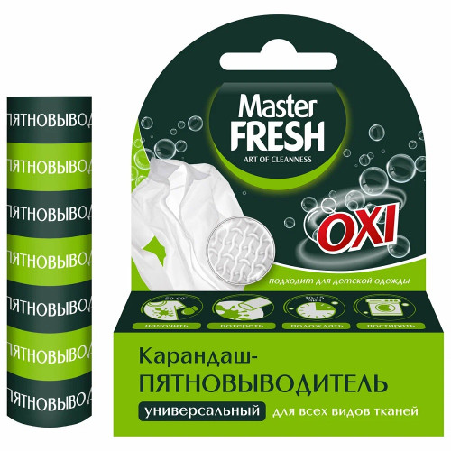 Карандаш-пятновыводитель Master Fresh станет вашим надежным помощником в поддержании чистоты и свежести текстильных изделий, обеспечивая безупречный результат и продлевая срок службы вашей одежды и домашнего текстиля.