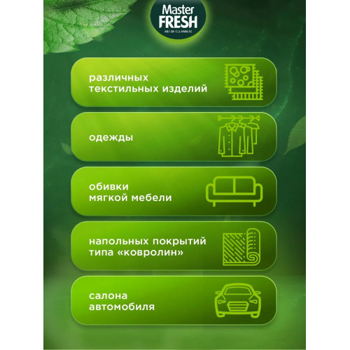 Master Fresh быстро проникает в структуру ткани и начинает действовать, образуя белую пену. Для достижения оптимальных результатов достаточно подождать всего 5-10 минут, после чего промыть обработанный участок водой.