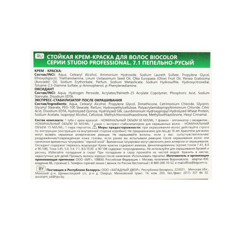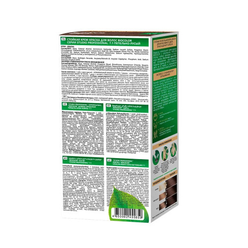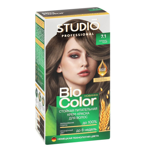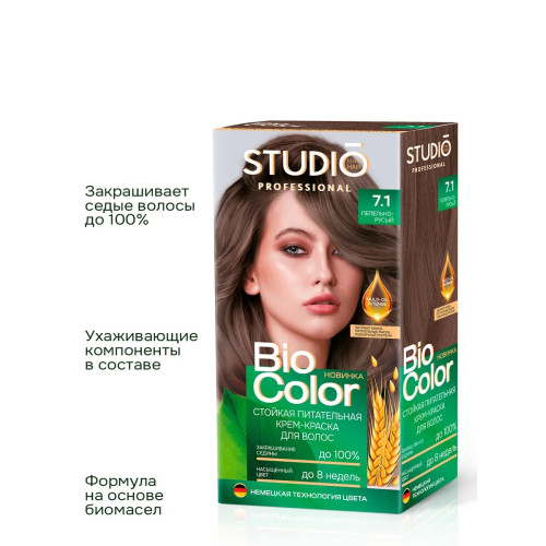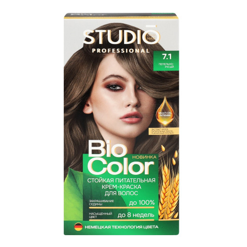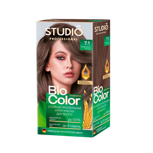 Краска для волос STUDIO Biocolor 7.1 Пепельно-русый – это невероятный блеск, стойкость цвета и полное закрашивание седины. Эксклюзивный комплекс формулы с кератином в сочетании с маслом ши и авокадо оказывают реконструирующее действие, восстанавливает водный баланс и упругость волос. Стойкость более 15 недель.
